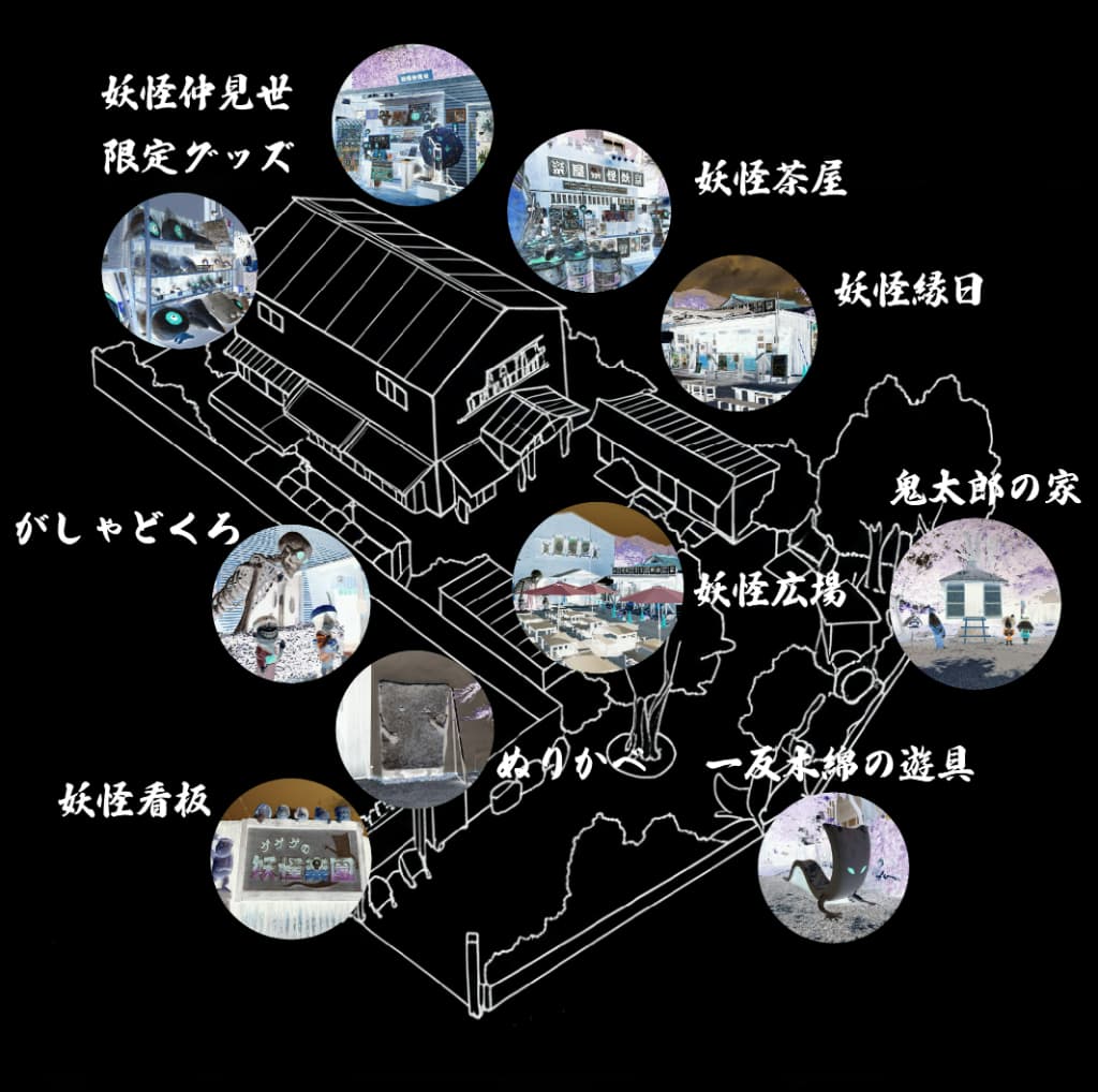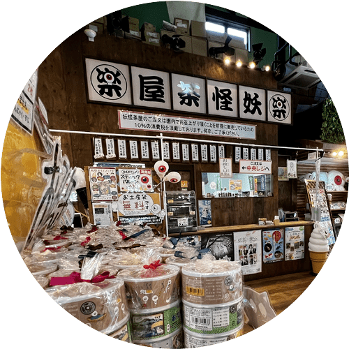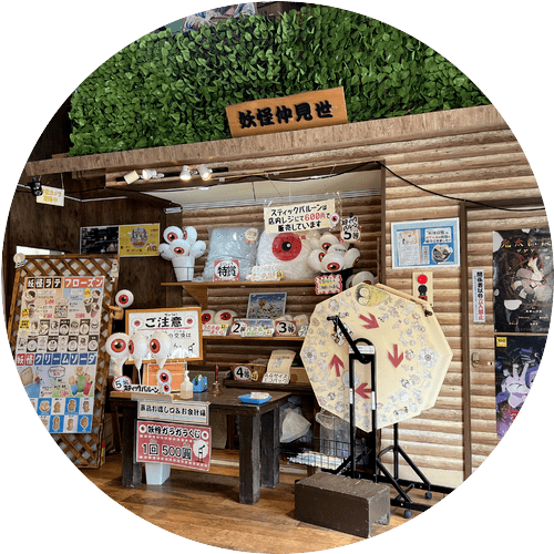 お子さまから大人の方まで、どなたでも気軽に立ち寄って楽しめるアットホームな空間。限定グッズや、妖怪をモチーフにしたユニークな食べ歩きメニューも充実しています。“ちょっぴり不思議で、どこか懐かしい”妖怪の世界で、家族や仲間と楽しいひとときをお過ごしください。